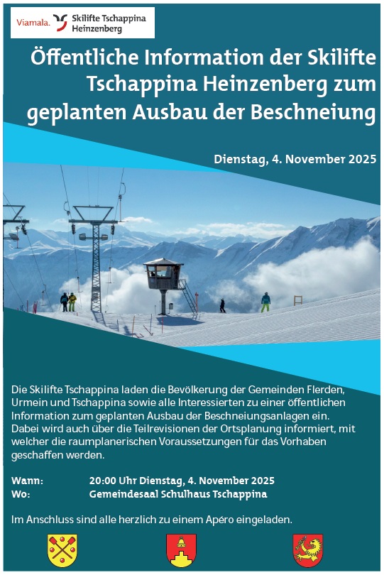 Die Skilifte Tschappina laden die Bevölkerung der Gemeinden Flerden, Urmein und Tschappina sowie alle Interessierten zu einer öffentlichen Information zum geplanten Ausbau der Beschneiungsanlagen ein.