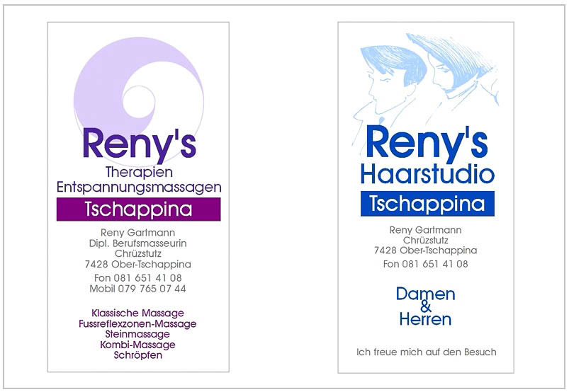 In Obertschappina, genauer an der alten Kantonsstrasse am Chrüzstutz, liegt unsere Wellness- und Beautyoase. In Reny's Haarstudio lassen sich viele HeinzenbergerInnen ihre Haare pflegen und schneiden, auch eine farbliche Veränderung oder ein neuer flippiger Style, bei Reny ist ein Jeder an der richtigen Adresse.