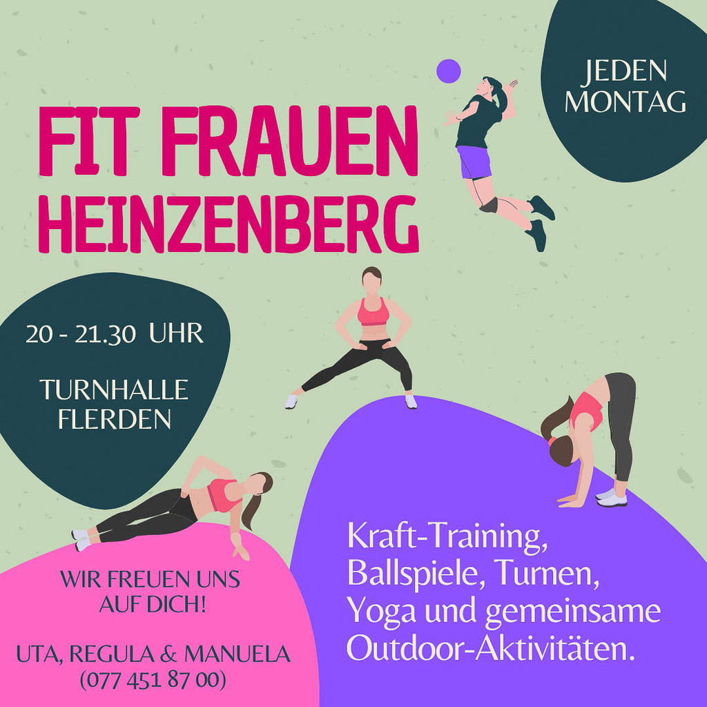 Willkommen sind alle Frauen aus der Region, die sich gerne fit halten möchten und dabei Spass haben. Es sind keine Vorkenntnisse notwendig. Die FIT FRAUEN werden gemeinsam geleitet von Uta, Regula und Manuela.